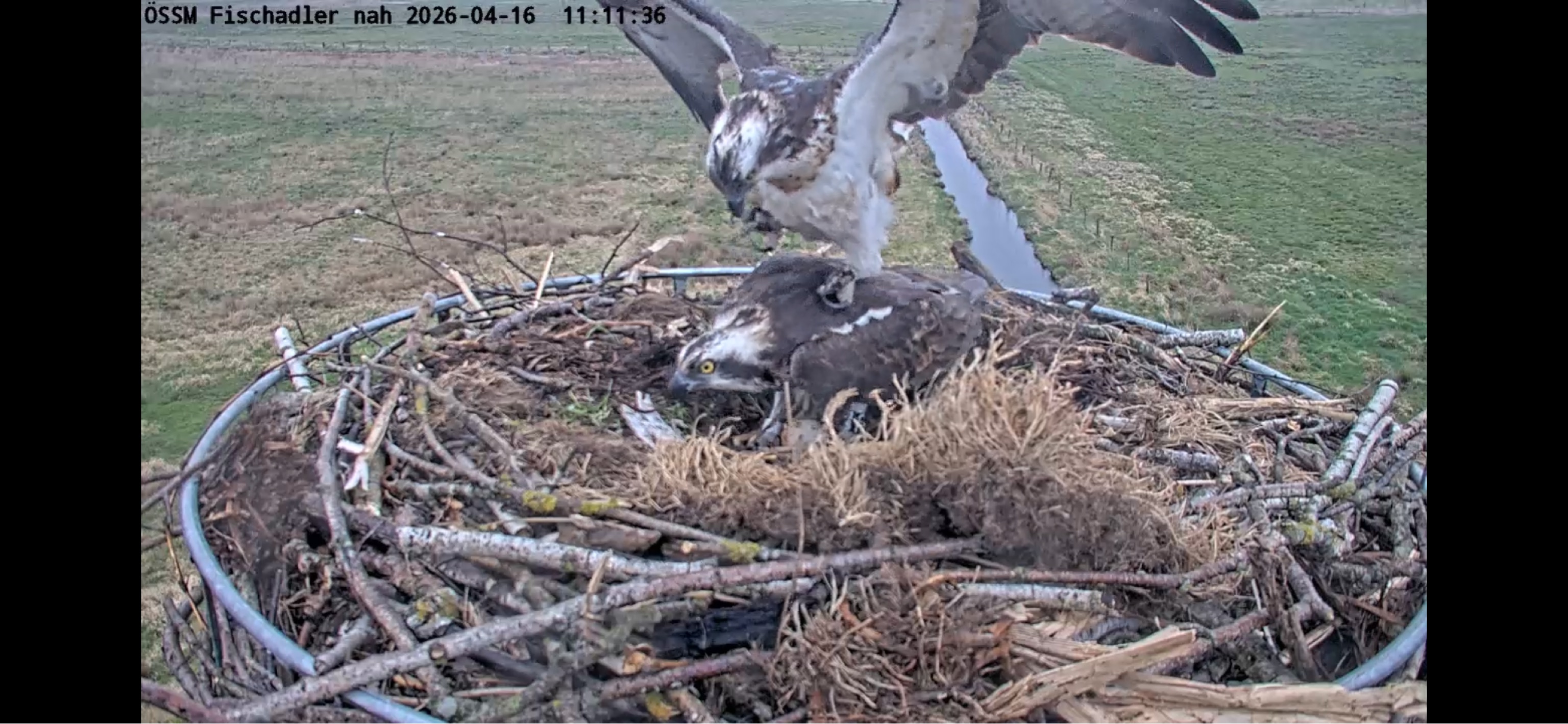 [ÖSSM: Eine spannende Beobachtung! Wir haben nachgeguckt, der zweite beringte Fischadler war ein Weibchen, das bereits im März auf dem Horst vor der Webcam kurzzeitig gesehen wurde.]