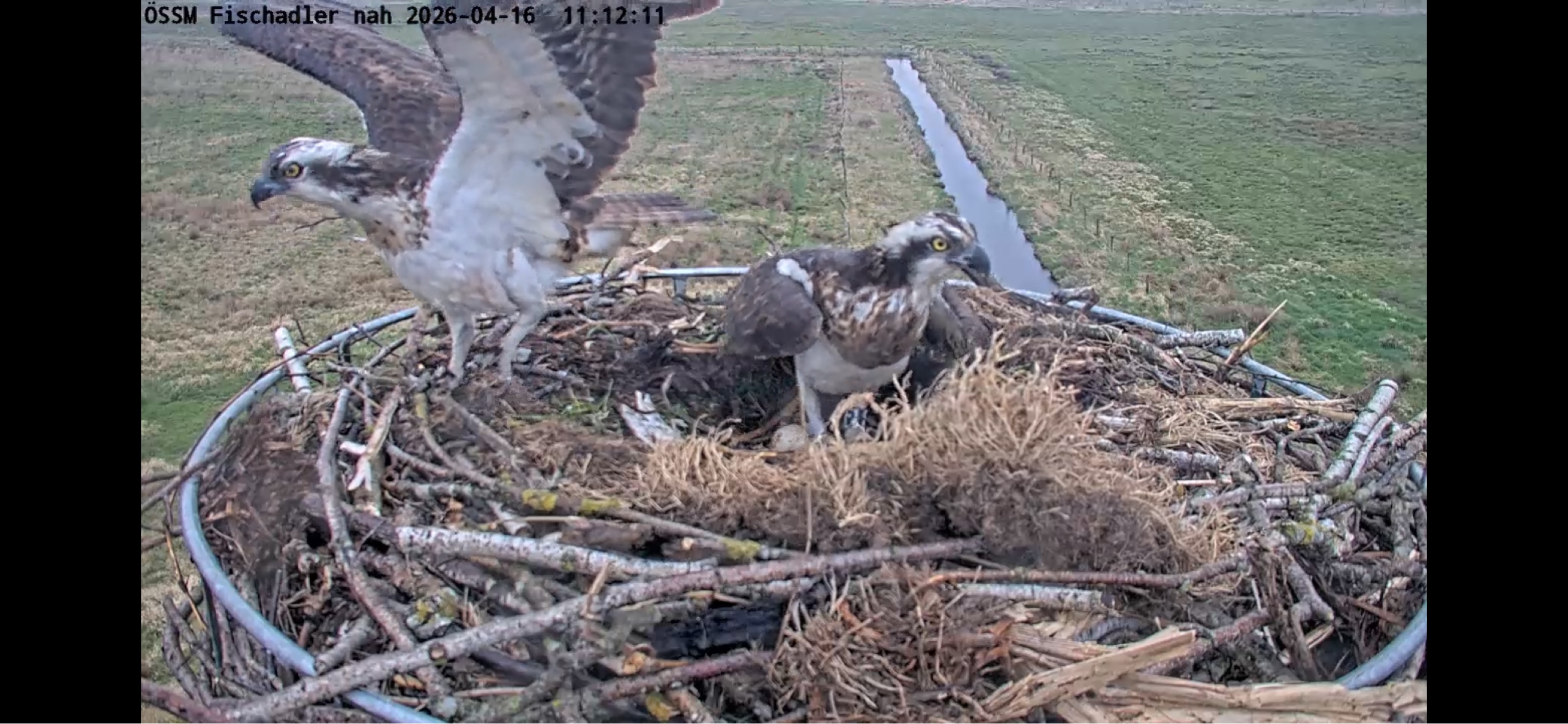 heute morgen (16.04.2026) um 6.12 h habe ich beobachten können, wie das Männchen auf den Horst zu geflogen kam und sich direkt auf das brütende Weibchen gesetzt hat. Ob es das beringte Männchen war oder ein anderer Fischadler [beim Brutpaar ist das Weibchen beringt, das Männchen unberingt], konnte ich nicht erkennen.